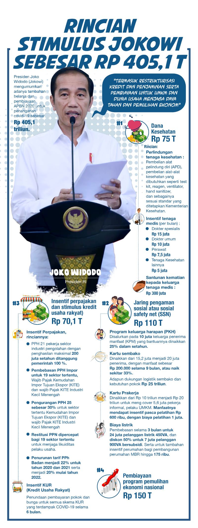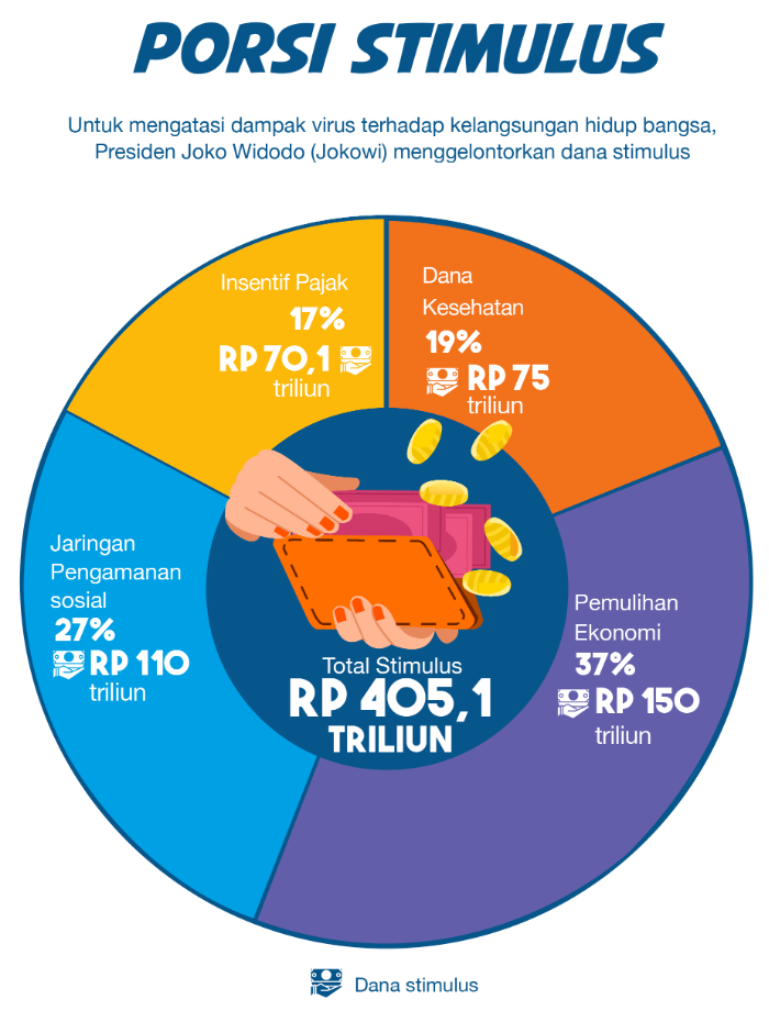 Untuk mengatasi dampak virus terhadap kelangsungan hidup bangsa, Presiden Joko Widodo (Jokowi) menggelontorkan dana stimulus Rp 405,1 triliun. Sebagian besar, atau nyaris 40% dari itu, dialokasikan untuk pemulihan ekonomi nasional dengan alokasi Rp 150 triliun.