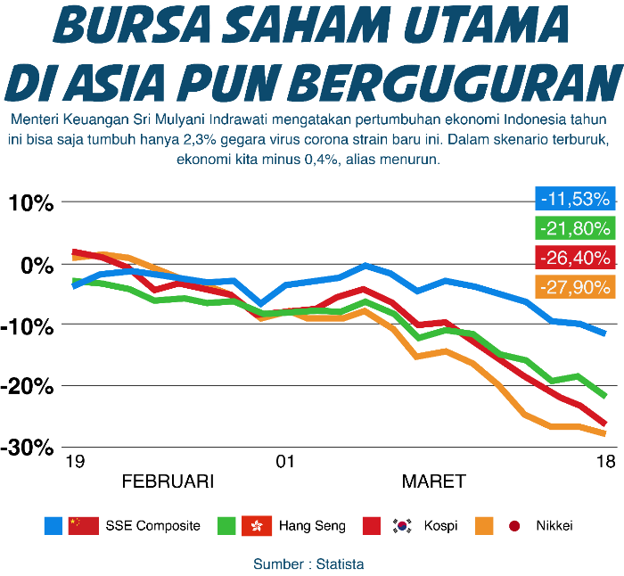 Tidak heran bursa saham utama di Asia pun berguguran. Di Indonesia, koreksi IHSG telah mencapai 28% sepanjang tahun berjalan.