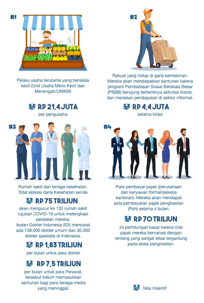 Kedua, rakyat yang hidup di garis kemiskinan. Mereka akan mendapatkan santunan karena program Pembatasan Sosial Berskala Besar (PSBB) berujung terhentinya aktivitas bisnis, dan menekan pendapatan di sektor informal.