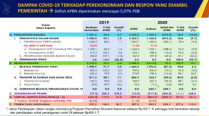 Dalam Dokumen yang disampaikan Pemerintah ke DPR seperti dikutip Srealm Indonesia, Senin (6/4/2020) tercatat defisit APBN akan mencapai 5,07% dari PDB atau nominalnya mencapai Rp 852,9 triliun sebelumnya defisit hanya Rp 307,2 triliun ditargetkan di APBN 2020 (Sebelum Pandemi Covid-19)