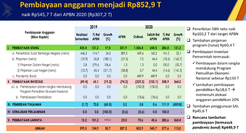 Untuk diketahui, pembiayaan utang ini dilakukan untuk menutup total defisit pada 2020. Defisit tahun ini menjadi Rp 852,9 triliun atau mengalami kenaikan Rp 545,7 triliun dari prognosa sebelumnya.