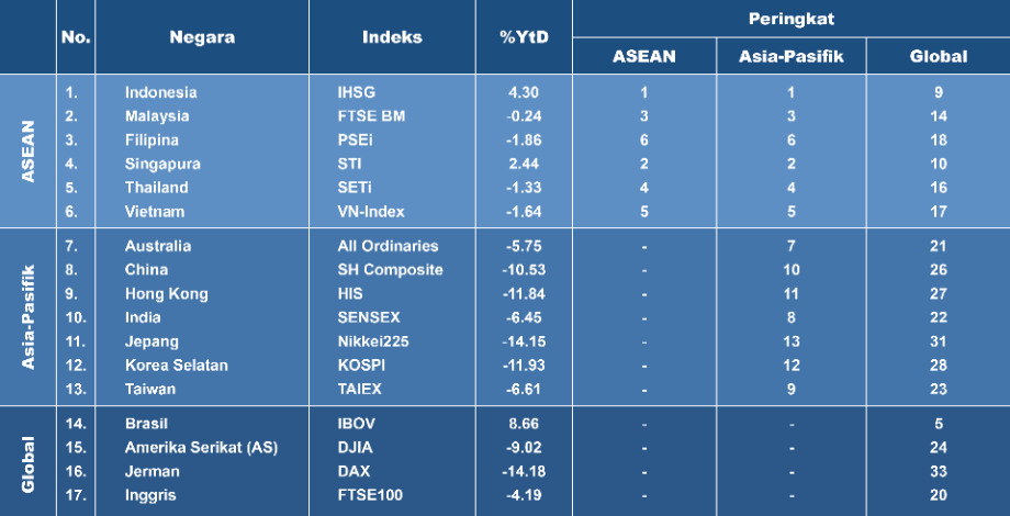 Hal tersebut membuat IHSG berada di peringkat pertama indeks saham acuan dengan kinerja paling moncer se-ASEAN, bahkan se Asia-Pasifik.