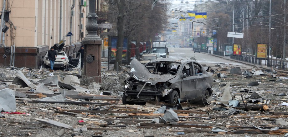 A view shows the area near the regional administration building, which city officials said was hit by a missile attack, in central Kharkiv, Ukraine, March 1, 2022.
